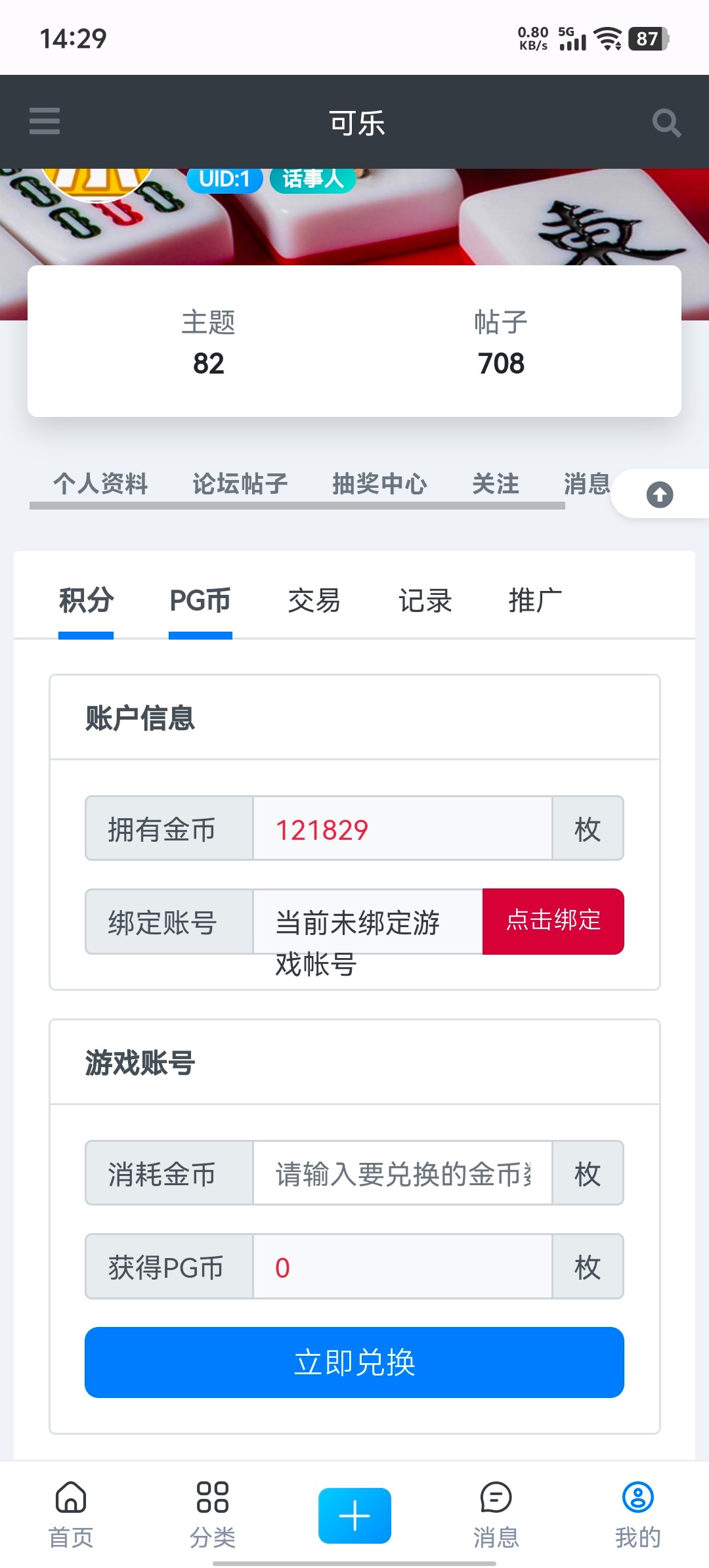 在个人中心点击积分,然后找的PG币, 【先注册好可乐PG账号哦,然后在兑换界面绑定游戏账号】